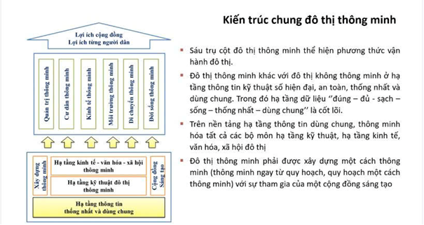 Tại hội nghị, Bộ Xây dựng cũng giới thiệu mô hình kiến trúc chung đô thị thông minh với sáu trụ cột: Quản trị thông minh, Cư dân thông minh, Kinh tế thông minh, Môi trường thông minh, Di chuyển thông minh, Đời sống thông minh