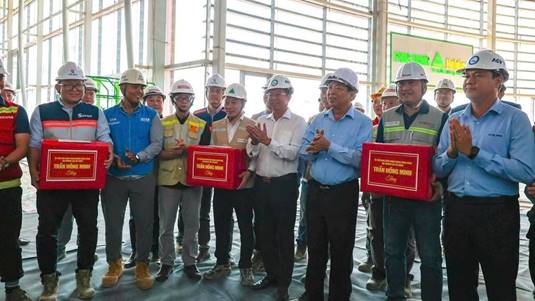 Bộ Trưởng Trần Hồng Minh tặng quà động viên các công nhân tại công trường