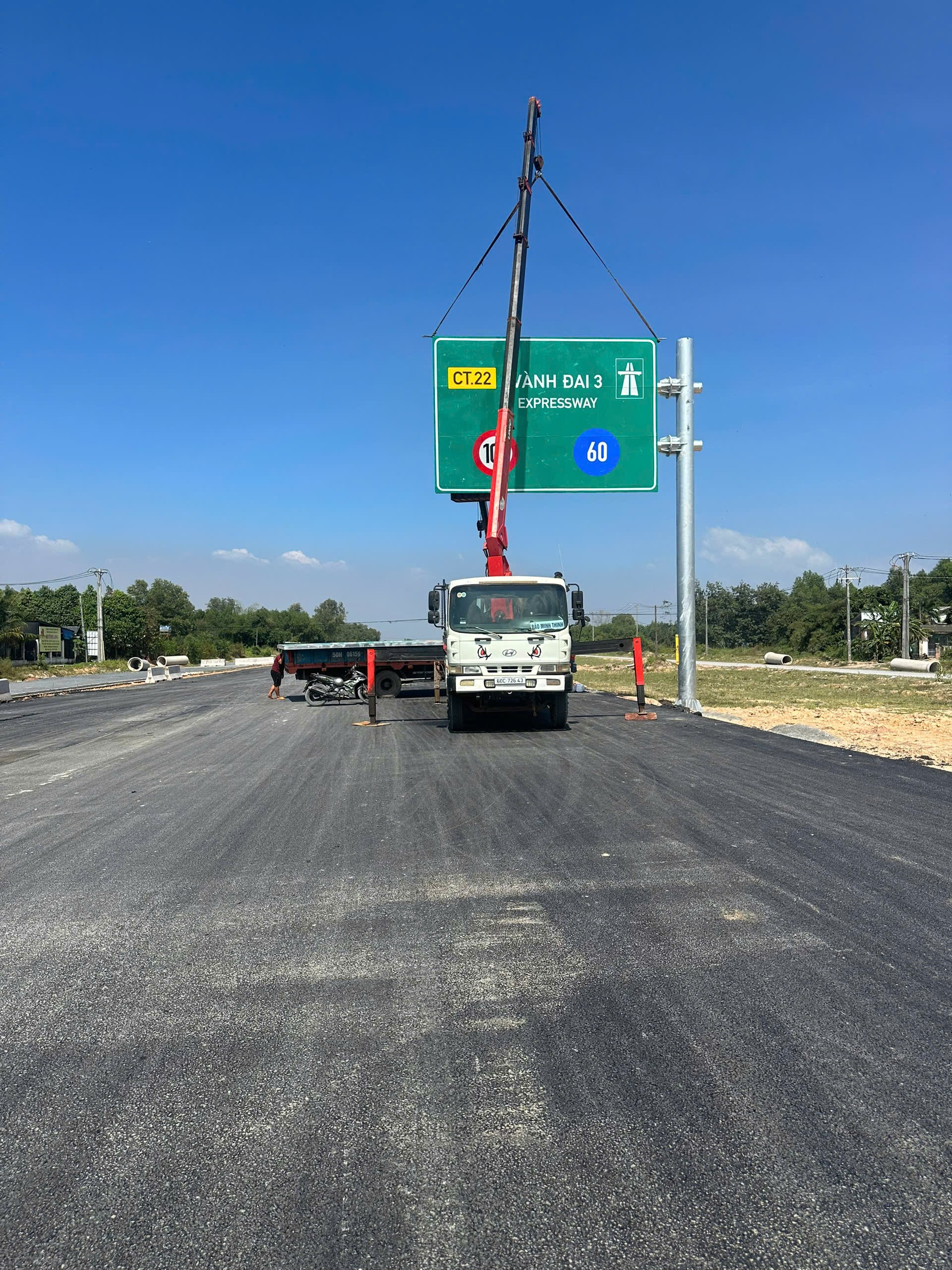 Công nhân lắp đặt biển báo, hoàn thiện các hạng mục phụ trợ Vành đai 3.