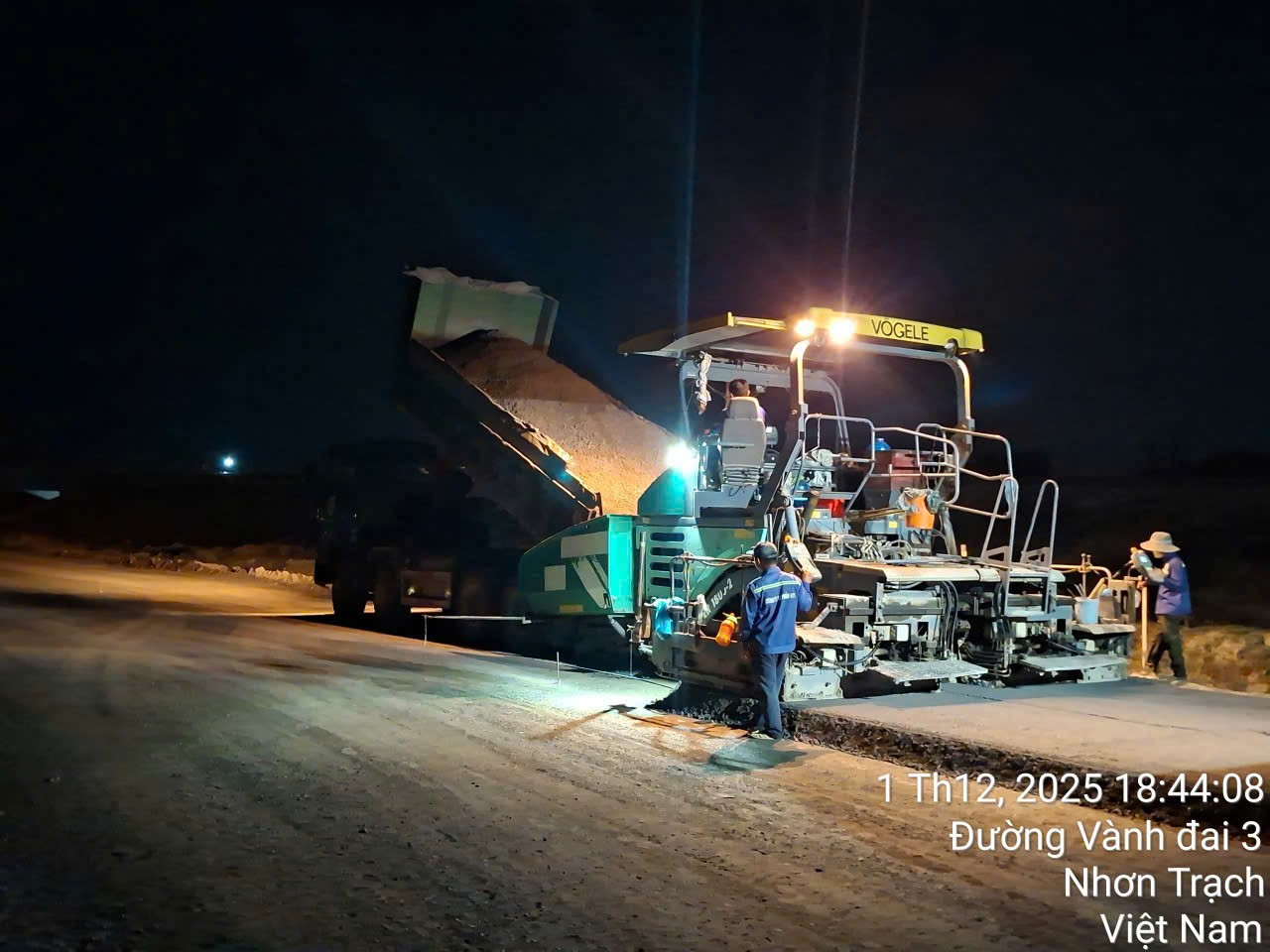 Công nhân và máy móc thi công xuyên đêm trên dự án Đường Vành đai 3