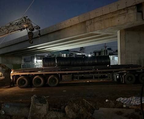 Xe đầu kéo chở cuộn thép phục vụ thi công cầu, đường được trung chuyển trong ca đêm theo phương án thi công ‘3 ca, 4 kíp’ tại Dự án Vành đai 3 TP.HCM