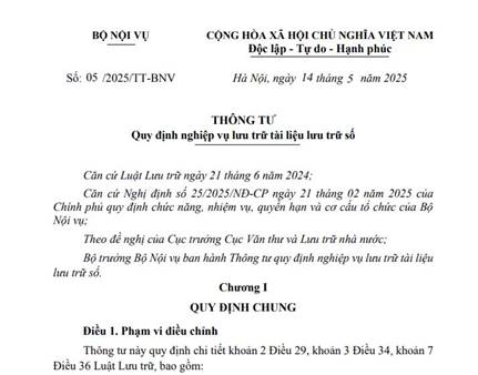 Thông tư 05/2025/TT-BNV do Bộ trưởng Bộ Nội vụ ban hành quy định nghiệp vụ lưu trữ tài liệu lưu trữ số, có hiệu lực từ 01/7/2025. Điểm mới quan trọng:
