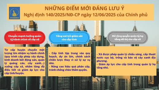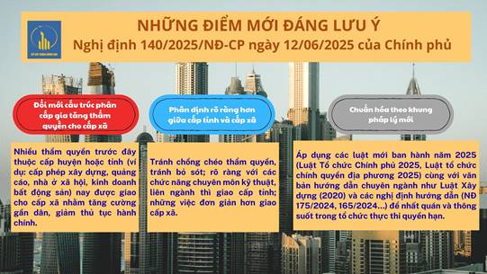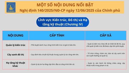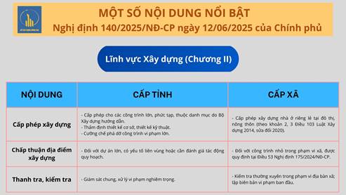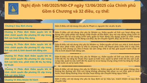 Ngày 12/6/2025, Chính phủ ban hành Nghị định 140/2025/NĐ‑CP ngày 12/06/2025 của Chính phủ về Quy định về phân định thẩm quyền của chính quyền địa phương 02 cấp trong lĩnh vực quản lý nhà nước của Bộ Xây dựng. Nghị định này gồm 6 chương, 32 điều, có hiệu lực từ ngày 01/7/2025, là cơ sở pháp lý quan trọng nhằm tăng cường phân quyền, phân cấp, nâng cao hiệu lực, hiệu quả quản lý, đồng thời phát huy tính chủ động, sáng tạo của địa phương trong lĩnh vực xây dựng.