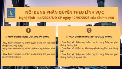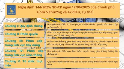 Ngày 12/6/2025, Chính phủ ban hành Nghị định số 144/2025/NĐ‑CP quy định về phân quyền, phân cấp trong lĩnh vực quản lý nhà nước của Bộ Xây dựng. Nghị định này gồm 5 chương, 47 điều, có hiệu lực từ ngày 01/7/2025, là cơ sở pháp lý quan trọng nhằm tăng cường phân quyền, phân cấp, nâng cao hiệu lực, hiệu quả quản lý, đồng thời phát huy tính chủ động, sáng tạo của địa phương trong lĩnh vực xây dựng.